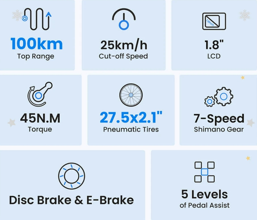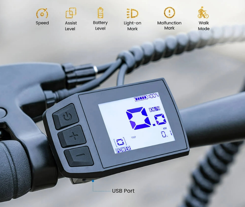 Az intelligens kijelző nem csak a sebességet és a megtett távot mutatja, hanem USB-portján keresztül akár a telefonodat is töltheted útközben. A gyalogos mód pedig akkor jön jól, ha tolni kell a bringát – ilyenkor 6 km/h-val segít előre.