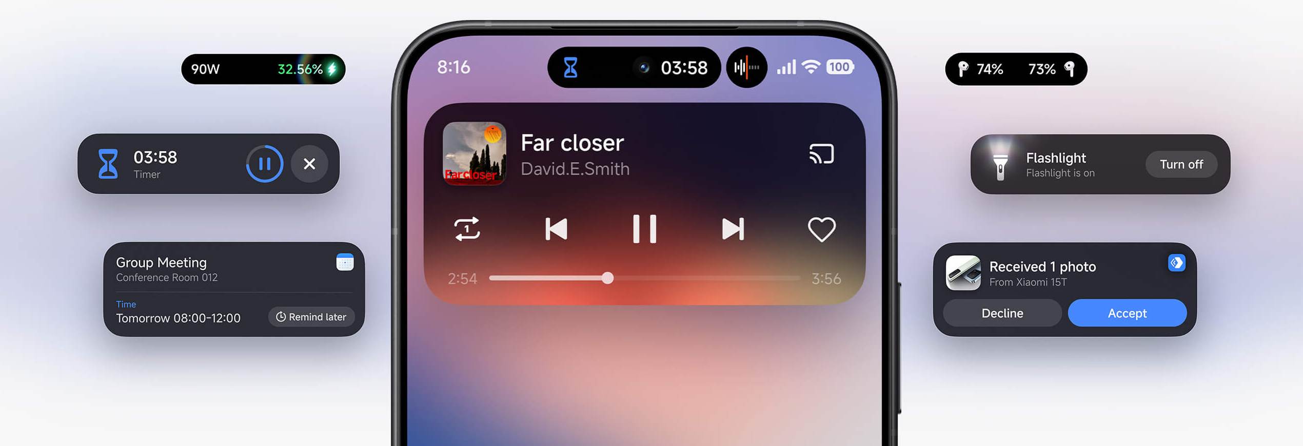 Az egyik legfeltűnőbb újítás a Super Island, ami valójában a korábbi lebegő értesítési megoldást váltja le. Az állapotsoron megjelenő kis „szigetek” most élő információkat mutatnak, például a zenelejátszás, időzítők vagy bejövő hívások esetén, így nem kell külön megnyitni az értesítési sávot.