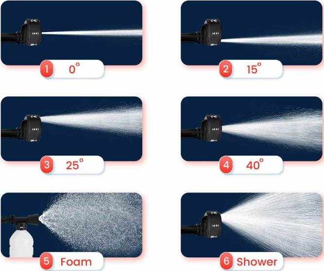 A csomagban találsz egy 6 az 1 ben fúvókát, amivel egyetlen tekeréssel válthatsz a vízsugár típusok között, nem kell külön fejeket cserélgetned munka közben.