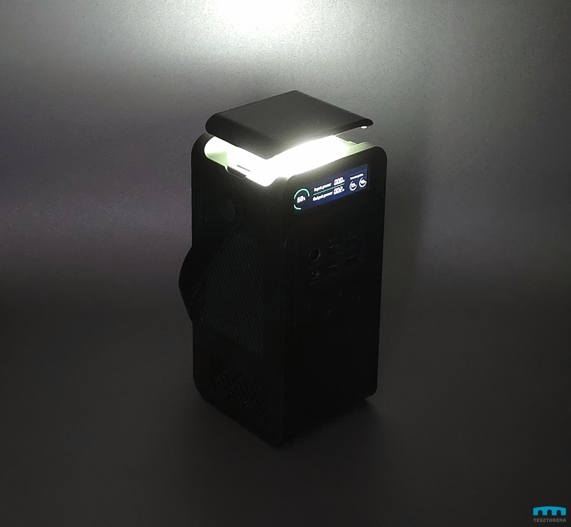 Kapott a tetejéből kihúzható világítást is, amely 2W-os, ami nyilván nem egy hatalmas fényerő, de például egy szobát, sátrat simán ellát annyi fénnyel, hogy biztonságosan tudjunk közlekedni.
