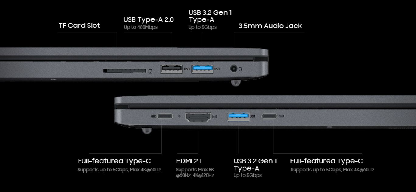 Bemenetekkel jól felszerelt, mert van két teljes funkcionalitású Type-C (monitor, töltés is megy), két USB 3, egy USB 2, 3.5mm jack, HDMI, memóriakártya is.