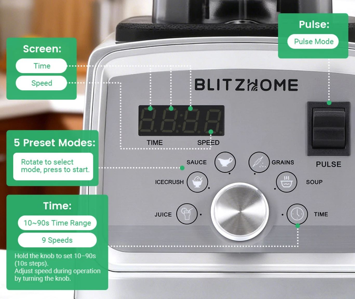 A kezelése kifejezetten felhasználóbarát. A vezérlőgombbal egyszerűen választhatóak ki az előre beállított programok, amelyek különböző felhasználási módokra vannak optimalizálva, de lehetőség van manuális beállításra is, ha valaki pontosan szeretné szabályozni a turmixolás idejét.