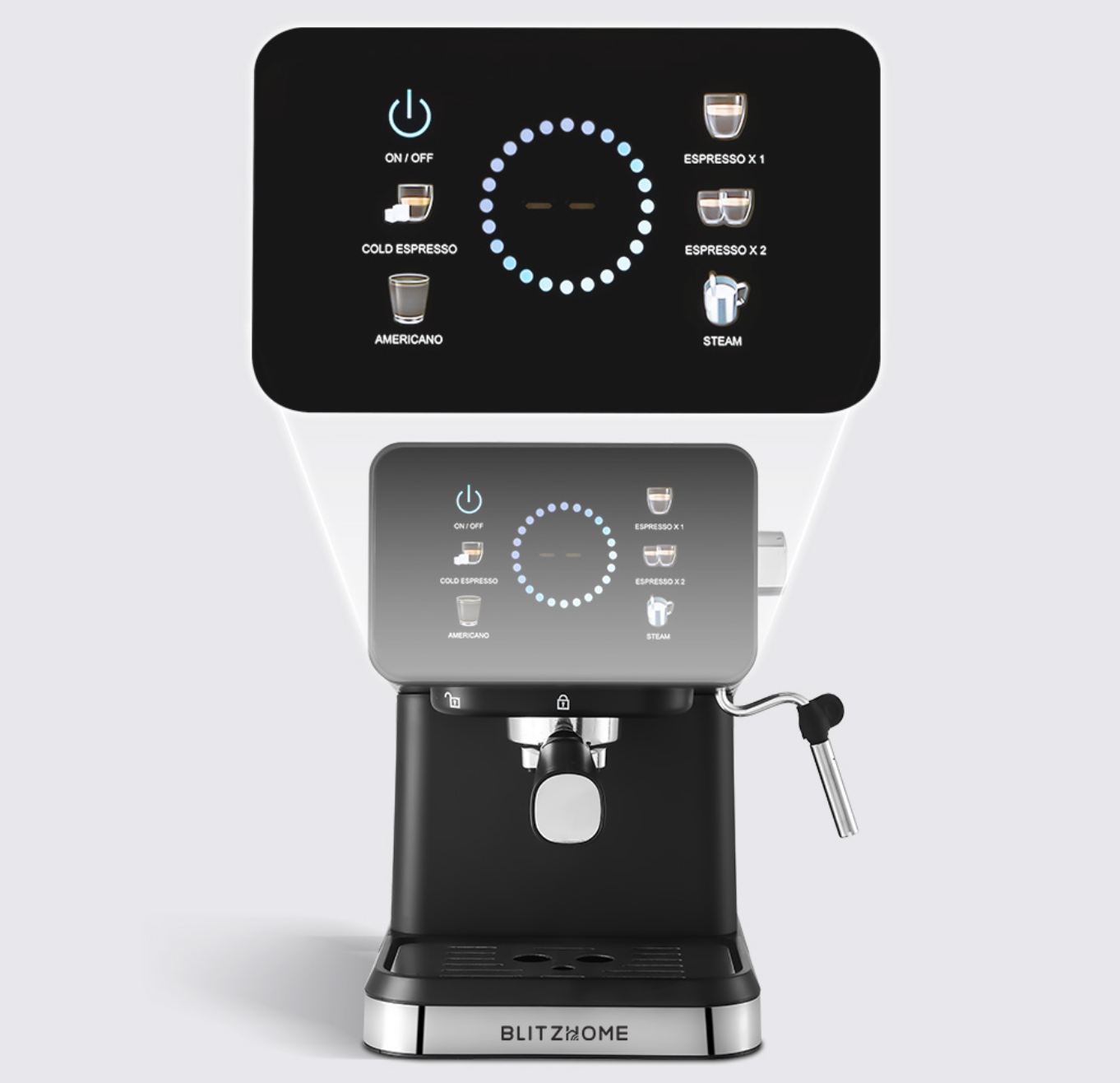 Egy és két csészényi kávét is tud főzni és a kávé mennyisége szabadon beállítható az érintőgombokkal.