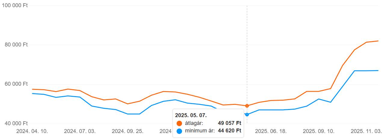 Ez például az Árukereső TOP 1 memória jelenleg és az árgörbe igen beszédes: a 44 000 Ft-os minimum árról fél év alatt 67 000 Ft-os minimum árra lőtt ki.