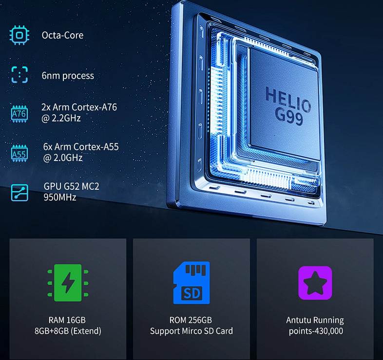 A MediaTek Helio G99 processzor nyolc maggal dolgozik és az alap 8 GB RAM mellé virtuálisan még 8 GB-ot adhatsz, így 16 GB-al számolhatsz.