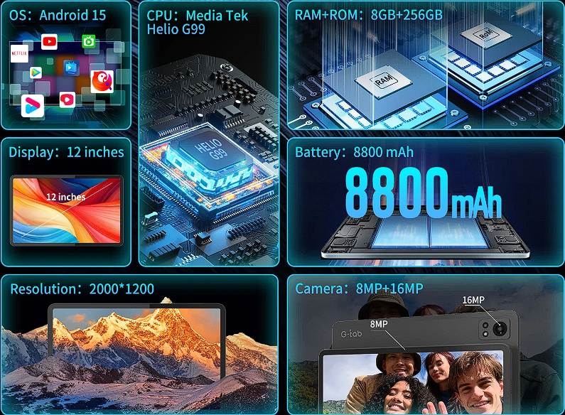 A G-Tab Mega az alacsony ára ellenére meglepően jó tablet 12″ méretű kijelzővel és fontos extrákkal, mint a Full HD streaming, GPS, SIM használat.