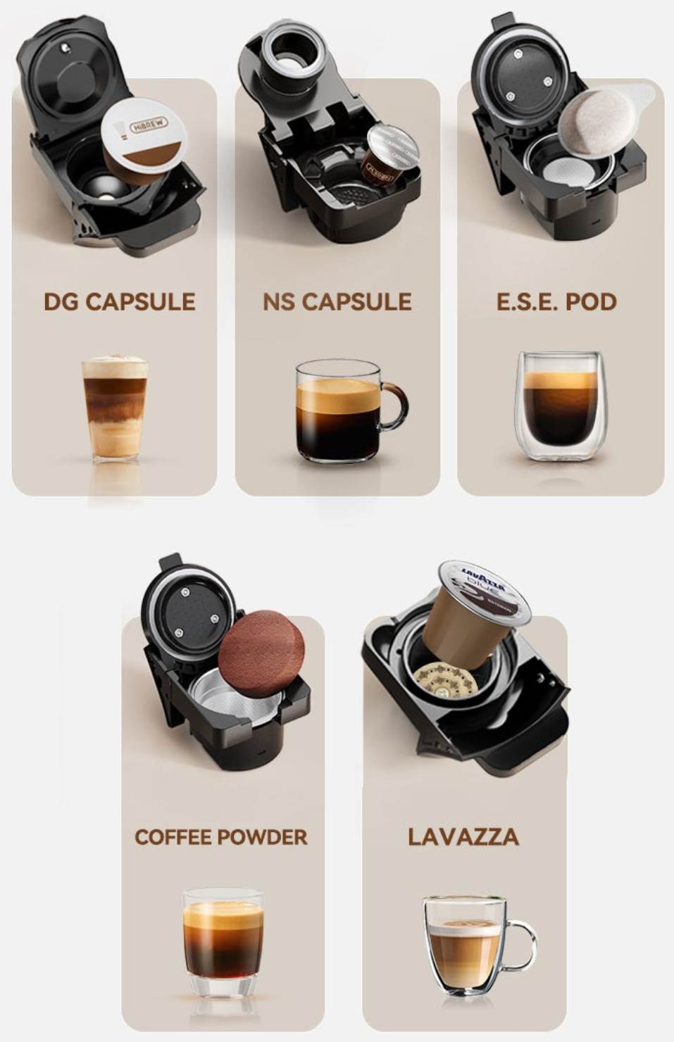 A kompatibilitása rendkívül jó, mert használható Dolce Gusto, Nespresso, Lavazza kapszulákkal, kávépárnával (pod) és őrölt kávéval is.