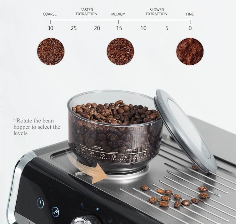 A darálás tekintetében 30 különböző szinten állítható a szemcseméret, így az egészen durvától a teljesen finom por állagig képes ledarálni a kávébabot.