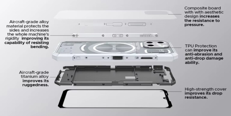 Rendkívül strapabíró anyagokból készült, amelyek a védelmet és a tartósságot szolgálják. Az esztétikus kialakítású kompozit lap fokozza a nyomásállóságot, míg a repülőgép-minőségű ötvözet megerősíti az oldalak védelmét, növelve a készülék merevségét és ellenálló képességét a hajlítással szemben.