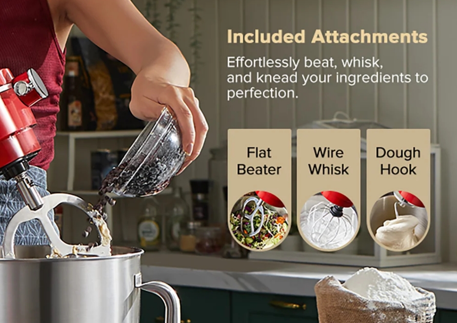 A három rozsdamentes acél tartozék – habverő, dagasztókar és keverőlapát – minden alapfeladatra bevethető, a szilikon spatula pedig megkönnyíti a tál tisztítását.