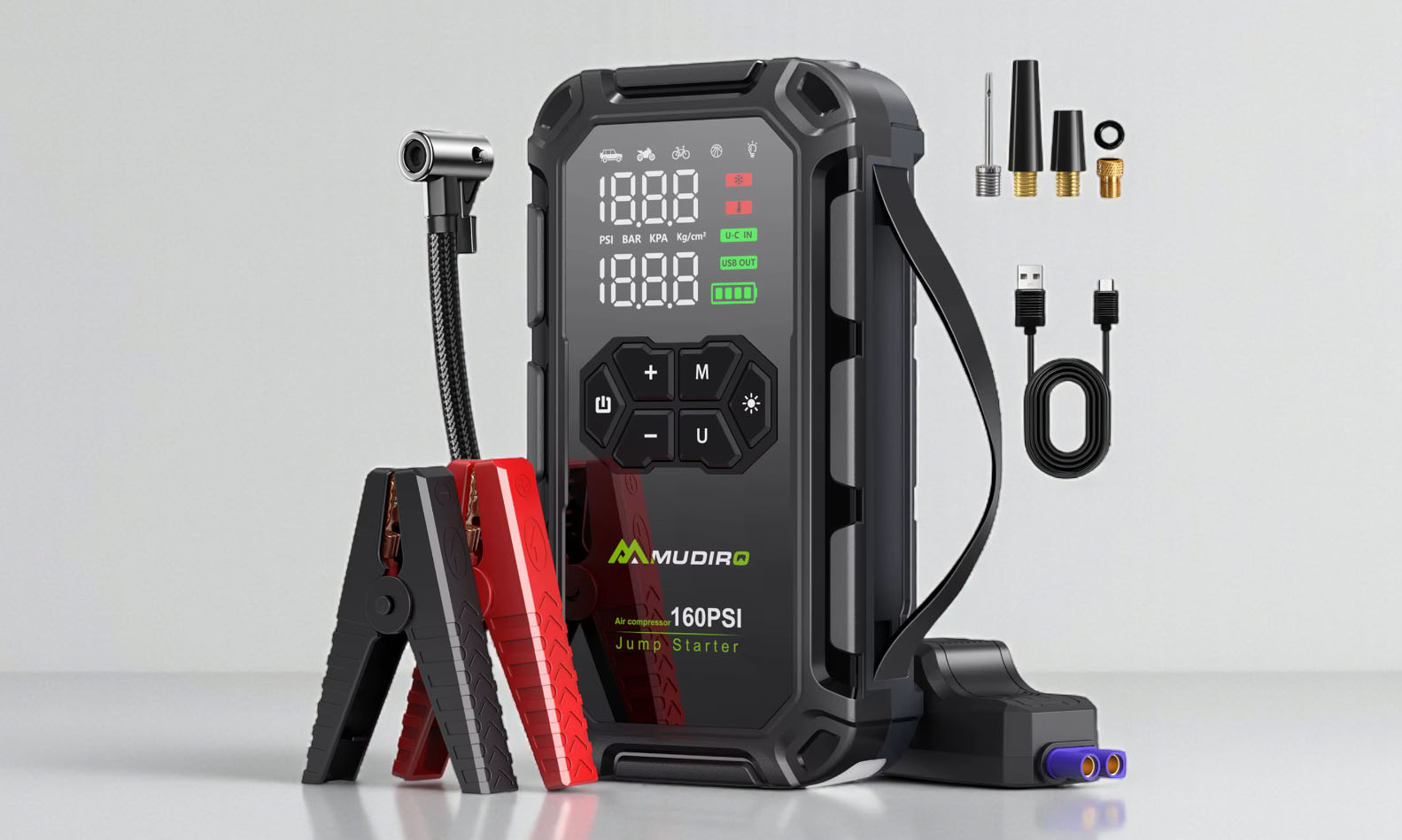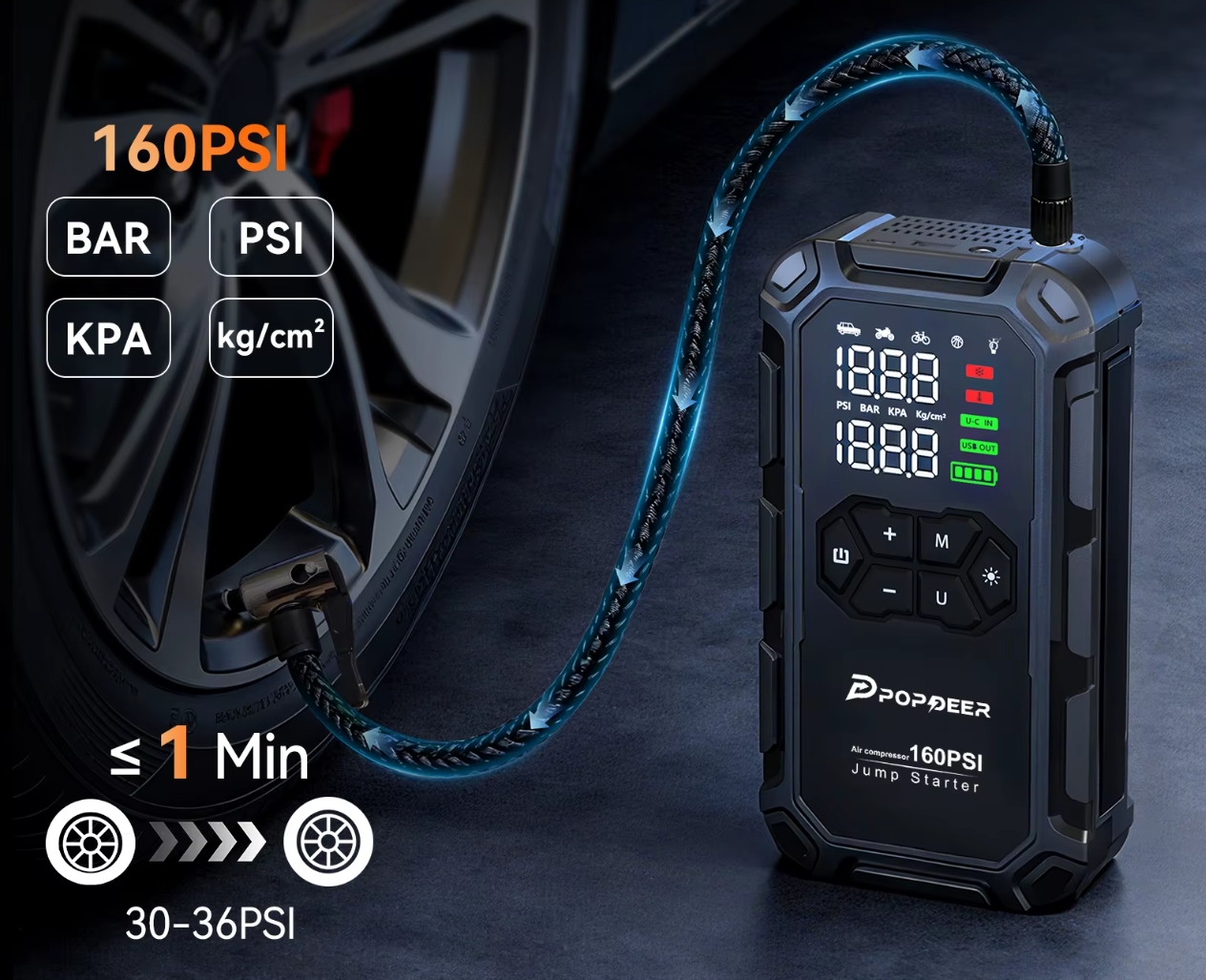 A beépített kompresszor a 160PSI maximális nyomással elég ahhoz, hogy egy átlagos személyautó gumiját percek alatt újra felfújja, de bringához, motorhoz vagy akár labdához is gond nélkül használható.