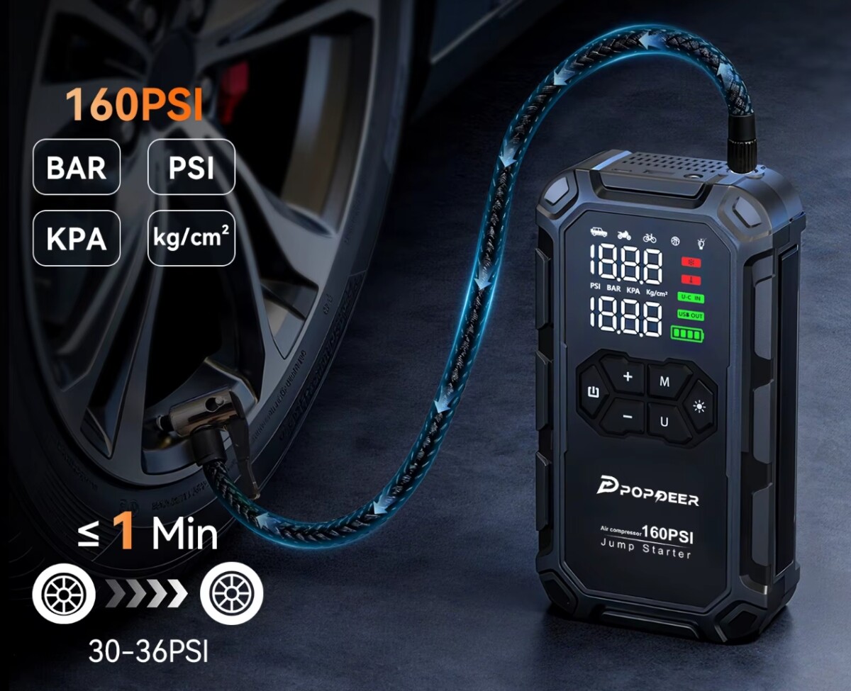 A POPDEER PD-JA66 nem egy tipikus olcsó autós vészkütyü, hanem egy komolyan használható többfunkciós eszköz, ami egyszerre indító, pumpa, power bank és lámpa.