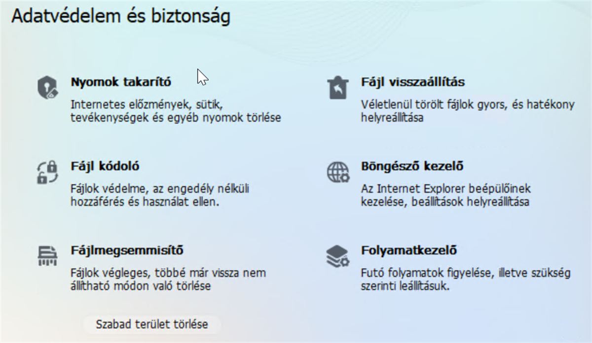 Az adatvédelemben is ad hasznos eszközöket, mint a fájl titkosítő, megsemmisítő.