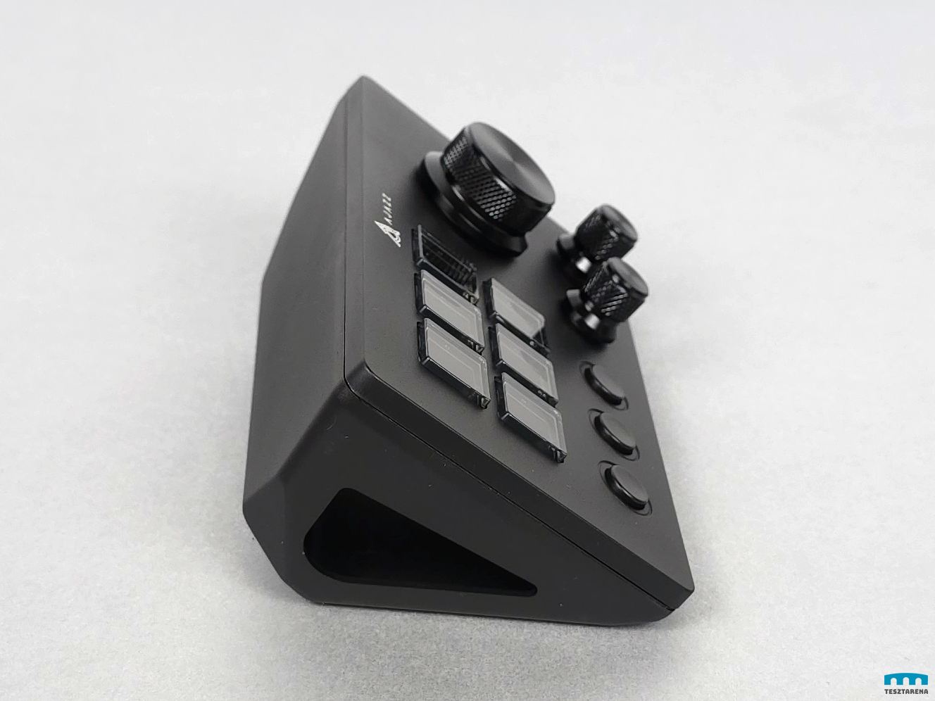 Illetve valójában ez egy stream deck, alternatíva az Elgato stream deckjeire és olyan funkciókat ad, hogy például OBS-ben gomb váltson jelenetet, egy másik indítsa vagy állítsa meg a streamet, egy harmadik némítsa a mikrofont, egy negyedik kapcsolja ki a kamerát, egy ötödik dobjon be egy szünet képernyőt, egy tekerő állítsa a mikrofon hangját, a másik a játék hangját, a harmadik meg az egész kimenetet.