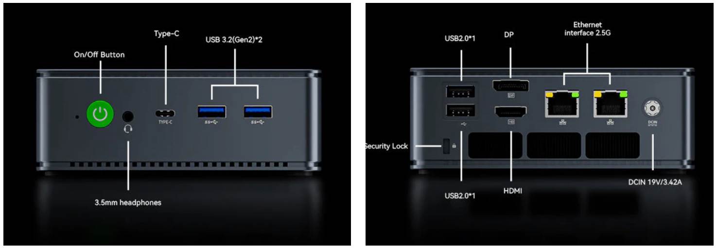 Ezúttal eléggé tipikus GMKtec dizájnt kapott, a színt is beleértve és az előlapon a kontrasztos gomb is megvan.