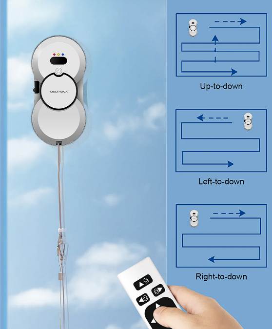 A távirányítóval bármikor átkapcsolhatsz a három tisztítási mód között. Fentről lefelé, balról lefelé, jobbról lefelé. A robot intelligens útvonaltervezéssel végigmegy az ablakon, és az AI alapú navigáció gondoskodik róla, hogy egy centiméter se maradjon ki.