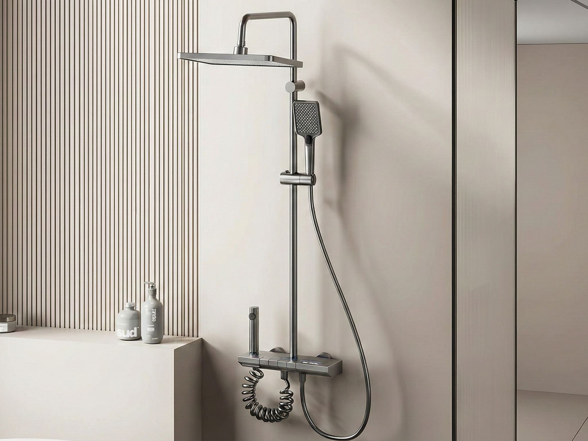 Nem egy tipikus megoldás, mert van egy nagy, fix magasságon lévő (de elforgatható) zuhanyfej, amely nagy területet beterít vízzel és két kisebb.