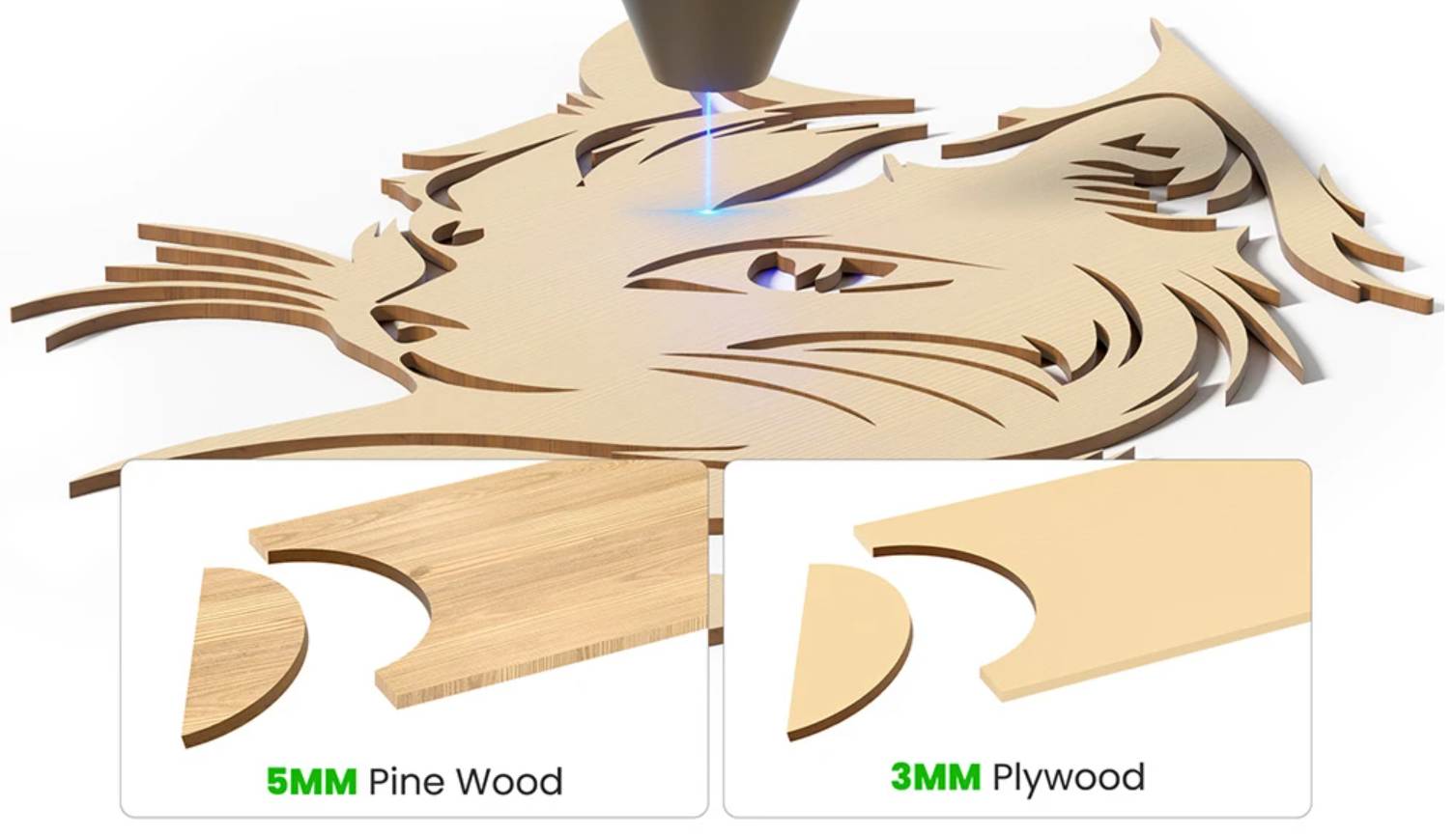 Vágni is lehet velük textilt, papírt és fát korlátozottan, ami jelen esetben 5mm-es fenyőt és 3mm-es furnért jelent. De lehet azért kísérletezni vastagabbal is és elérhető 10W-os lézerrel, ami jelentősen erősebb.