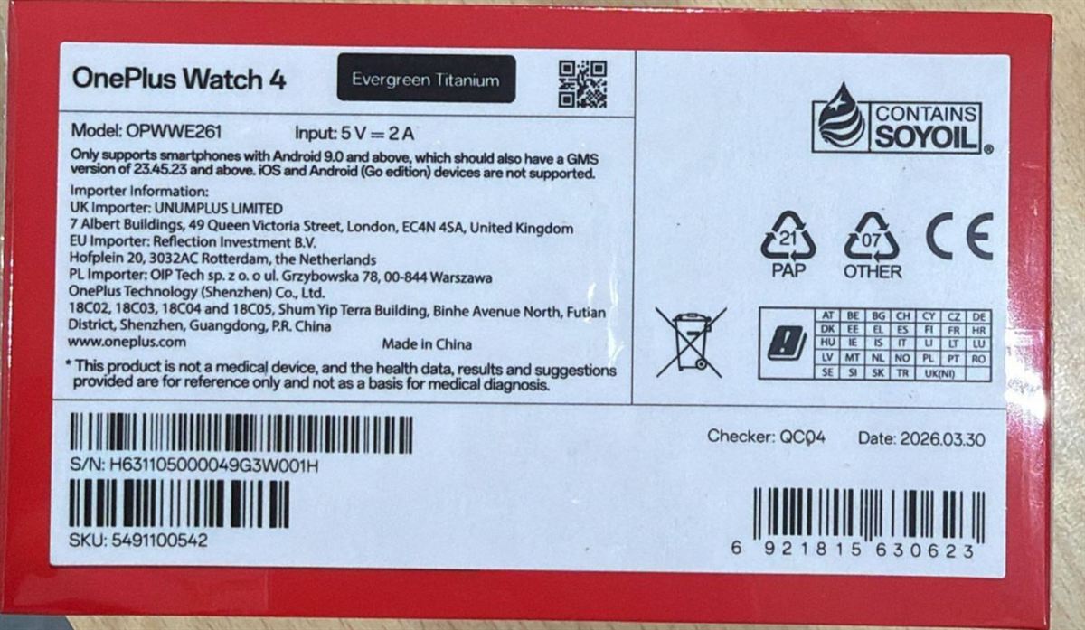 A hátoldal még néhány hasznos részletet elárul. A modellszám OPWWE261-ként szerepel, ami egybevág a korábbi tanúsítványokkal. Európai szempontból fontos, hogy a dobozon az Egyesült Királyságra, az EU-ra és Lengyelországra vonatkozó importőri adatok is megtalálhatók, ami erősen arra utal, hogy már a rajtnál széles körű elérhetőség várható.
