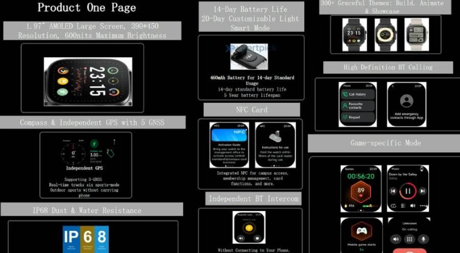 A dizájn sokban emlékeztet az Apple Watch Ultra 2-re, még a szíjak formája is hasonló. Két színben várható: fekete és ezüst.