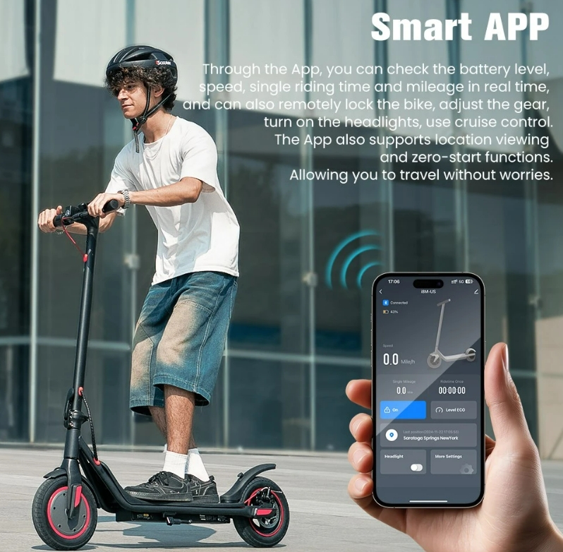 Az iScooter i9M nemcsak gyors és kényelmes, de okos is. Az applikációval (iOS és Android) távolról zárolhatod, ellenőrizheted az akkumulátor töltöttségét, a sebességet, a megtett távolságot, és beállíthatod a világítást vagy a tempomatot is.