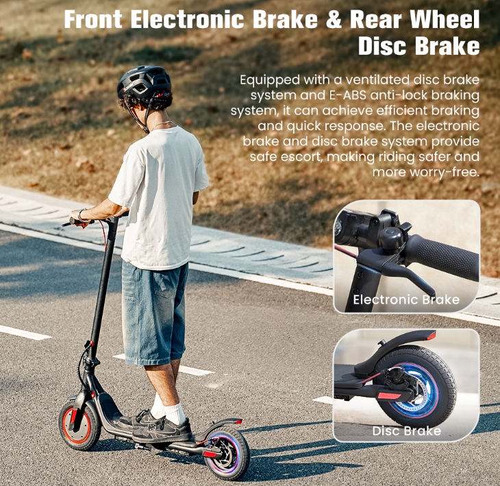 A biztonságot a dupla fékrendszer garantálja: elöl elektronikus, hátul pedig tárcsafék dolgozik, kiegészítve E-ABS blokkolásgátlóval. Ez gyors és hatékony fékezést biztosít, legyen szó hirtelen megállásról vagy lassabb gurulásról forgalmasabb szakaszokon.