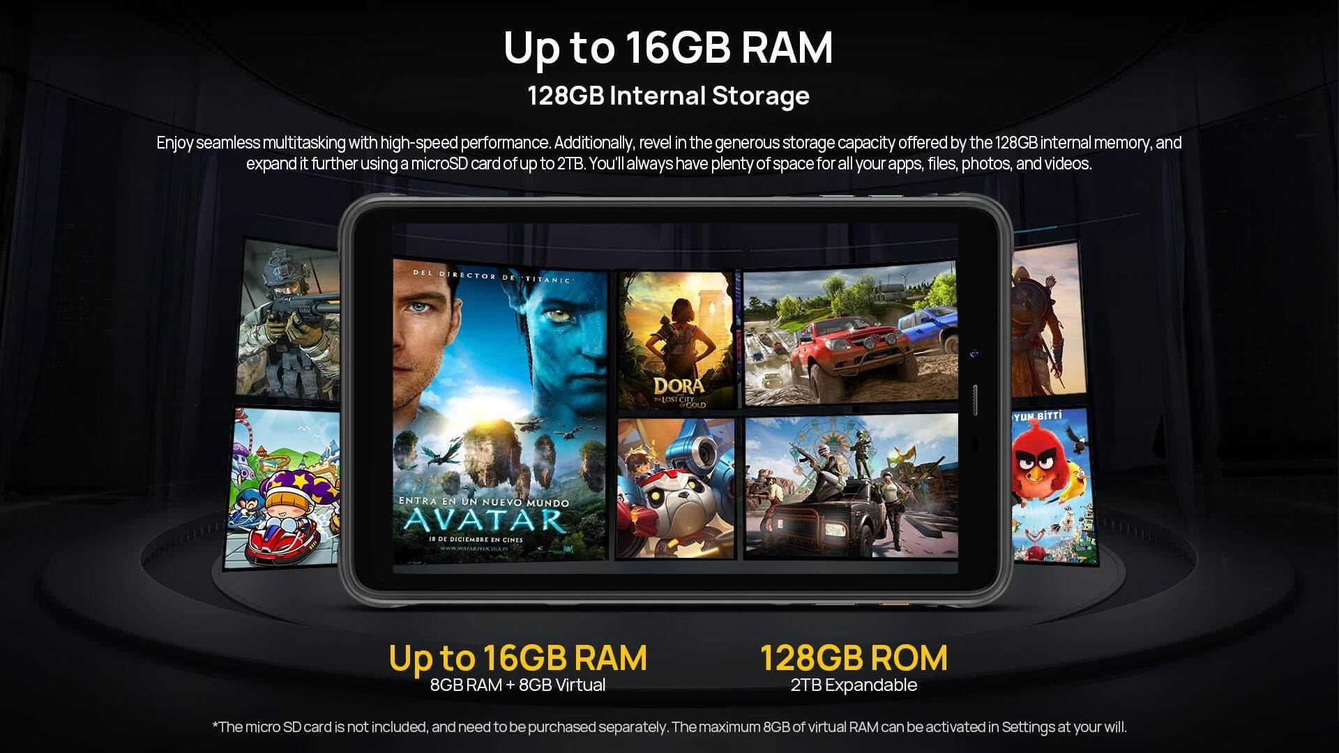 A motorháztető alatt a MediaTek MT8788 (8 mag: 4×Cortex‑A73 + 4×Cortex‑A53, 2.0GHz) dolgozik, ami a mindennapi appokhoz és ipari/terepi használatra szánt feladatokhoz stabil tempót ad. Memóriából 8GB RAM jár, tárhelyből 128GB, amely microSD‑vel bővíthető, így nagyobb térképek, jegyzőkönyvek, fotók is kényelmesen elférnek.