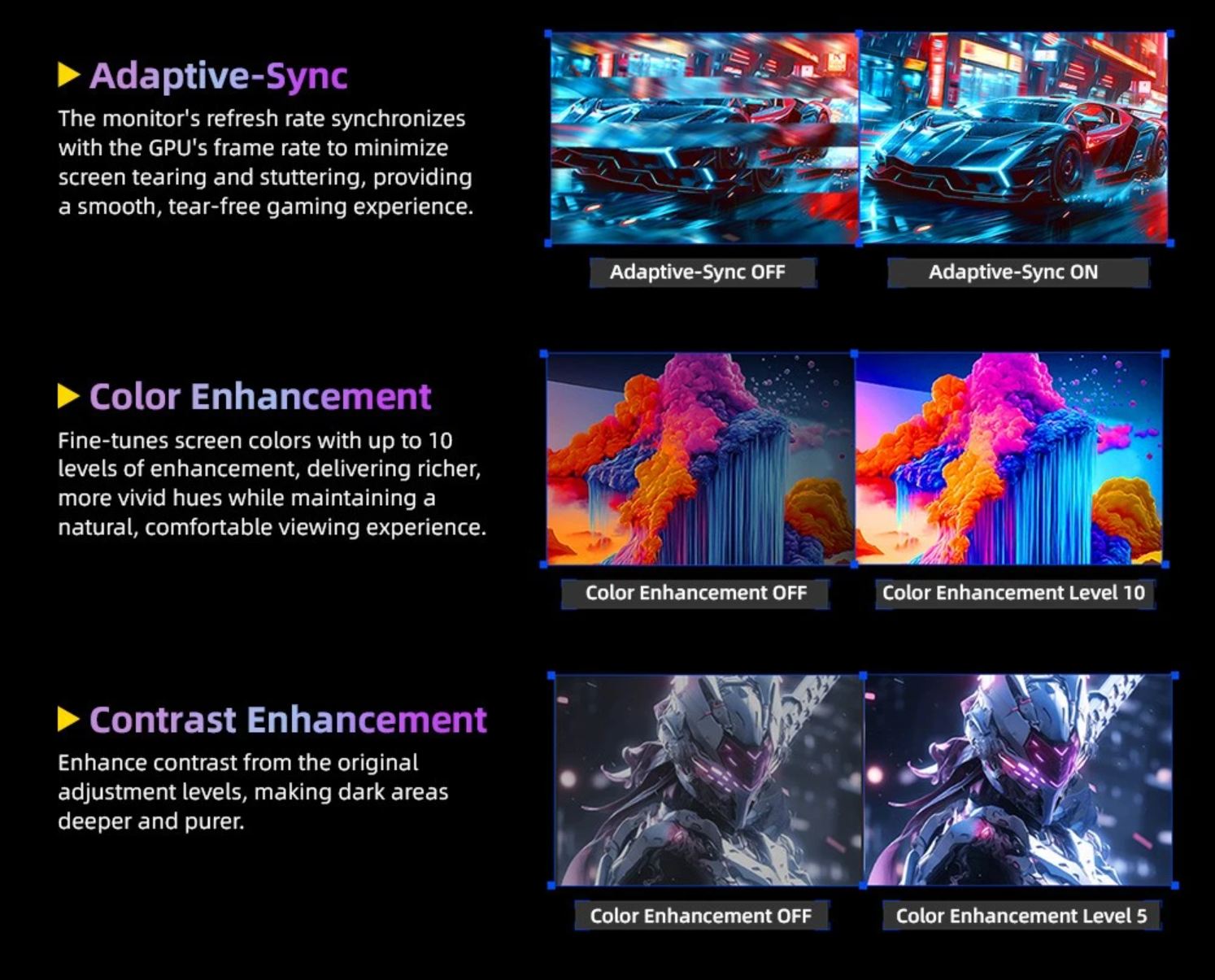 Finomhangolja a képernyő színeit akár 10 szintű javítással, gazdagabb, élénkebb árnyalatokat adva a természetes, kényelmes megjelenítés megőrzése mellett és növeli a kontrasztot az eredeti beállítási szintekhez képest, így a sötét területek mélyebbek és tisztábbak lesznek