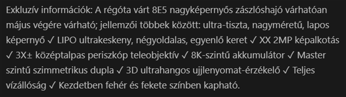 A legújabb „8E5” platformra épül, amely várhatóan Snapdragon 8 Elite 5 néven kerül piacra és egy hatalmas, 6.9″ méretű AMOLED kijelző, 1.5K felbontású, négy oldalon rendkívül vékony kávájú sík panel, LIPO technológiával.