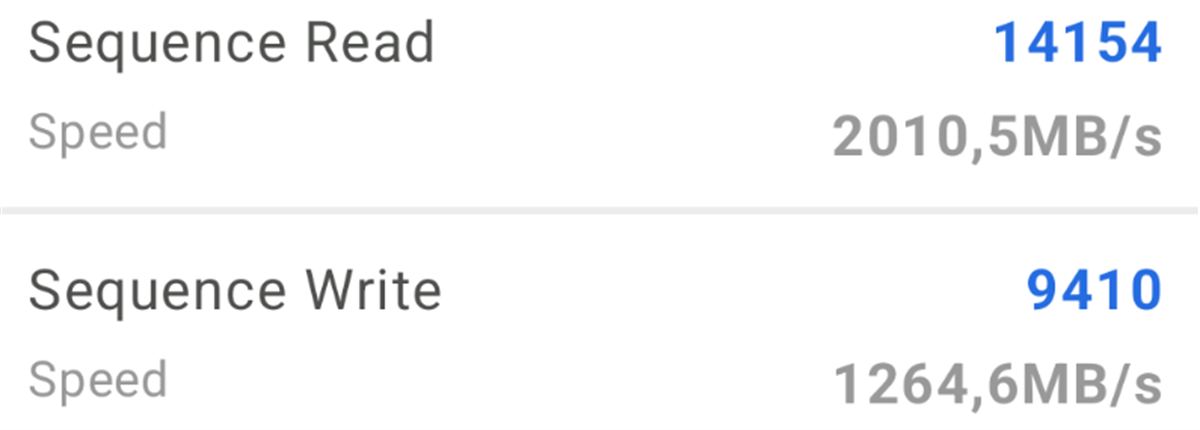 A nagy és bővíthető, 512GB-os tárhelyének maximális olvasási és írási sebessége jó, 1200 MB/mp írási és 2000MB/mp olvasási sebességgel.