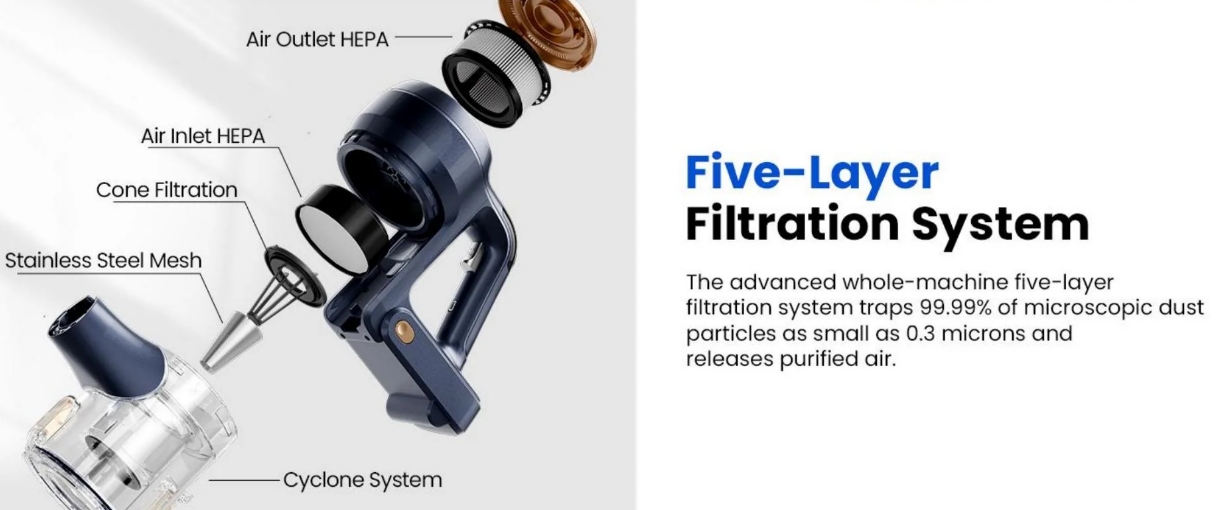 Az 5 elemű szűrőrendszer a legapróbb porszemeket is felfogja, így biztos lehetsz benne, hogy nem kerül vissza szinte semmi a levegőbe.
