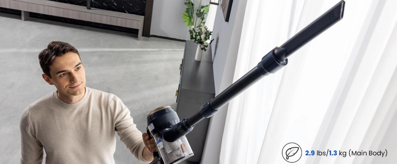 A Proscenic P11 Lite megjelenése izgalmasabb, de még nem túl kirívó és a könnyű, mindössze 1,3 kg-os főegység kényelmes fogást biztosít és ez a porszívó a legszűkebb helyeken is könnyedén elfér.