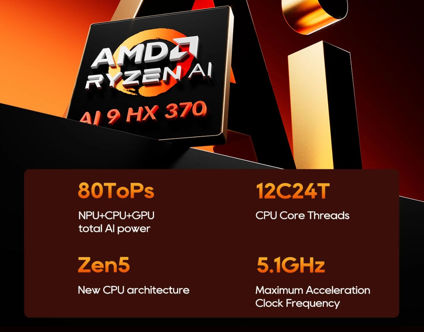 Az AMD Ryzen AI 9 HX 370 a Strix Point széria zászlóshajója, egy csúcskategóriás processzor, amely az AI teljesítményre épít. A 12 magos, 24 szálas felépítés hibrid architektúrán alapul: 4 Zen 5 teljesítménymag, 8 Zen 5c energiatakarékos mag dolgozik össze. Alapórajele 2.0 GHz, boost órajele elérheti a 5.1 GHz-et.