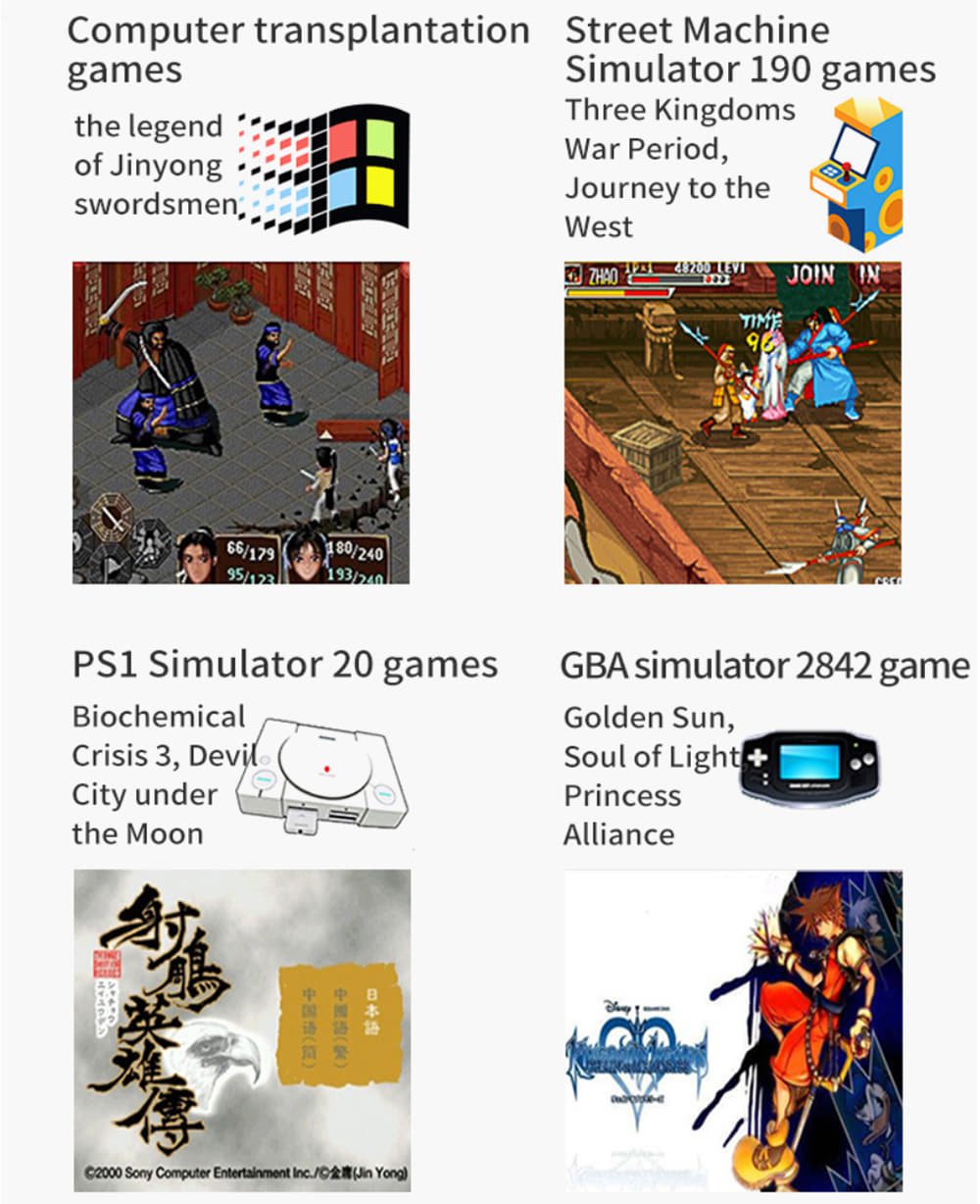 PS1, CPS1, CPS2, FBA, NEOGEO, NEOGEO POCKET, GBA, GBC, GB, SFC, FC, MD, SMS, GG, Handy, MSX, PCE, WSC, POKE MINI, stb.