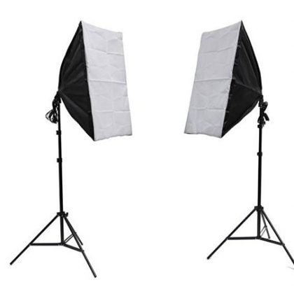 A softbox egy kontrolláltabb, irányított és erőteljes fényforrás, amelyet azonban lágyít az elejére helyezett anyag, így nem “égeti ki” a megvilágítandó objektumot (tárgyat, egyebet). 3db van a csomagban, mindegyik magassága, dőlésszöge állítható. Kettő oldalról történő világításhoz, míg egy fentről történő világításhoz használható. 12db 45W-os (5500K színhőmérséklettel) kompakt, energiatakarékos izzó van a csomagban, mindegyik softbox-hoz 4db szükséges. A softbox-ok maximális magassága 2m.