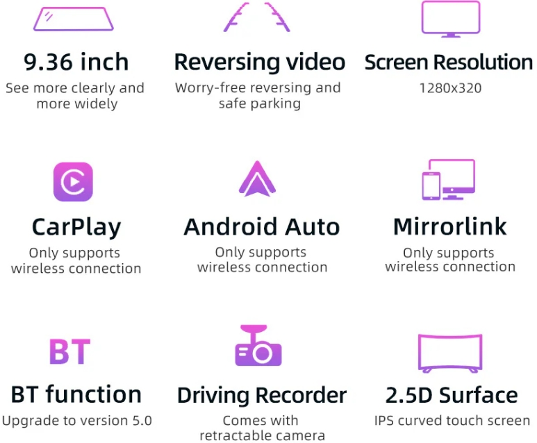 - Kijelző: 9,36 colos 2.5D érintőképernyő