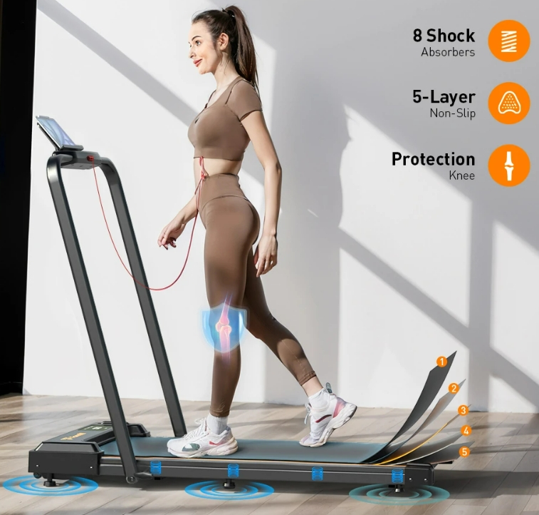A futófelület 5 rétegű, csúszásmentes, 8 gumírozott rezgéscsillapítóval, ami kíméli az ízületeket. A LED kijelzőn minden alapvető adat – sebesség, idő, távolság, kalória – azonnal látható.