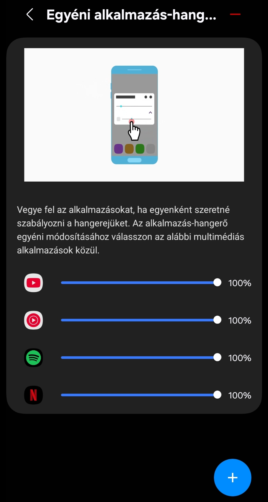 Az egyéni alkalmazás hangerőben hozzáadhatjuk azokat az alkalmazásokat, amelyeknek a hangerejét egyedileg szeretnénk szabályozni.