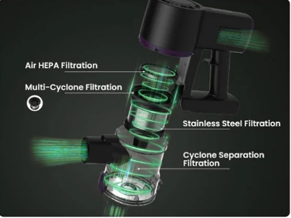 A különleges jellemzője a szűrőrendszer, amely a CycloneFlow technológiára épül. Ez a fejlett rendszer a mikroszkopikus porszemcsék 99,97%-át képes kiszűrni, egészen 0.1 mikron méretig.