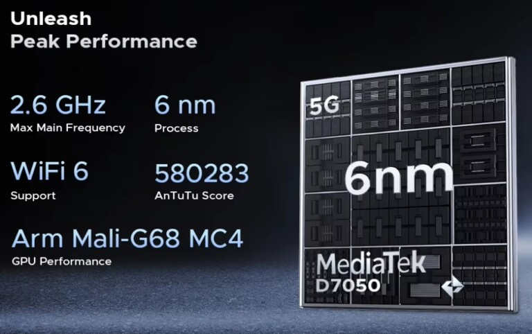 A MediaTek Dimensity 7050 adja az erőt plusz 12GB RAM (20GB-ra bővíthető virtuális memóriával) és 256GB tárhely (bővíthető memóriakártyával, max. 2TB).