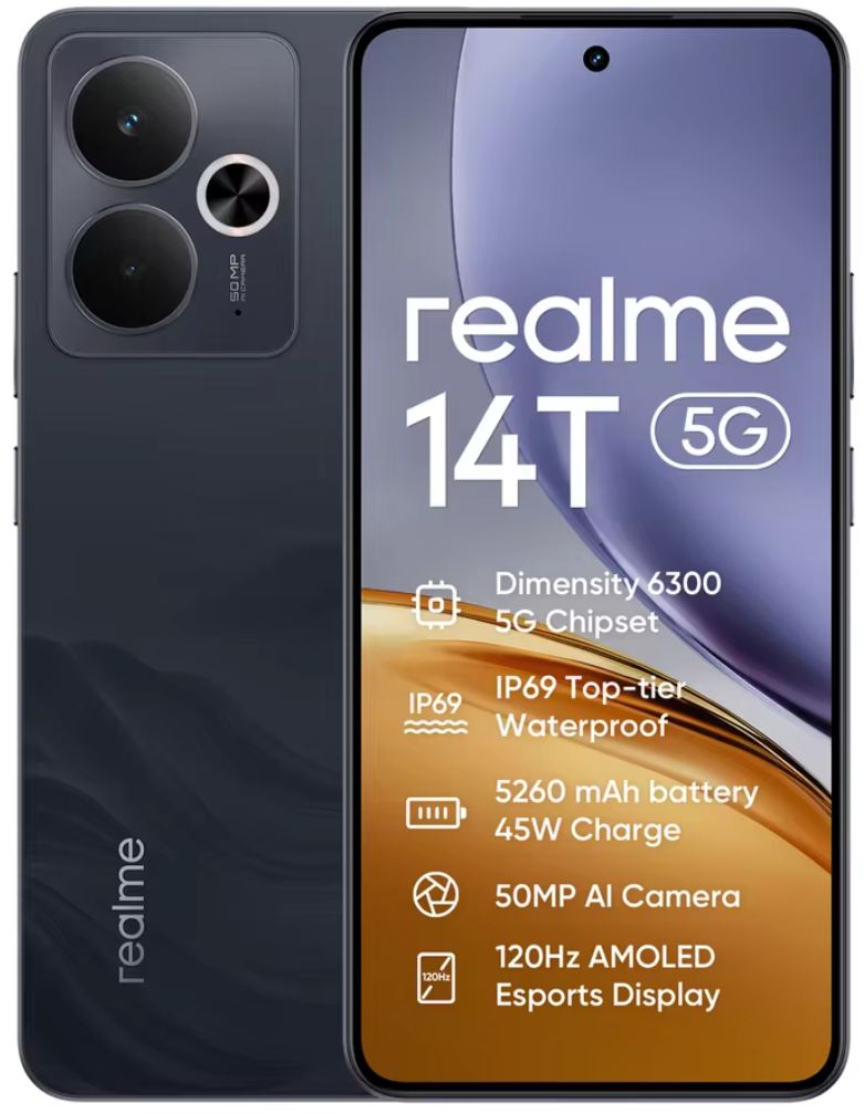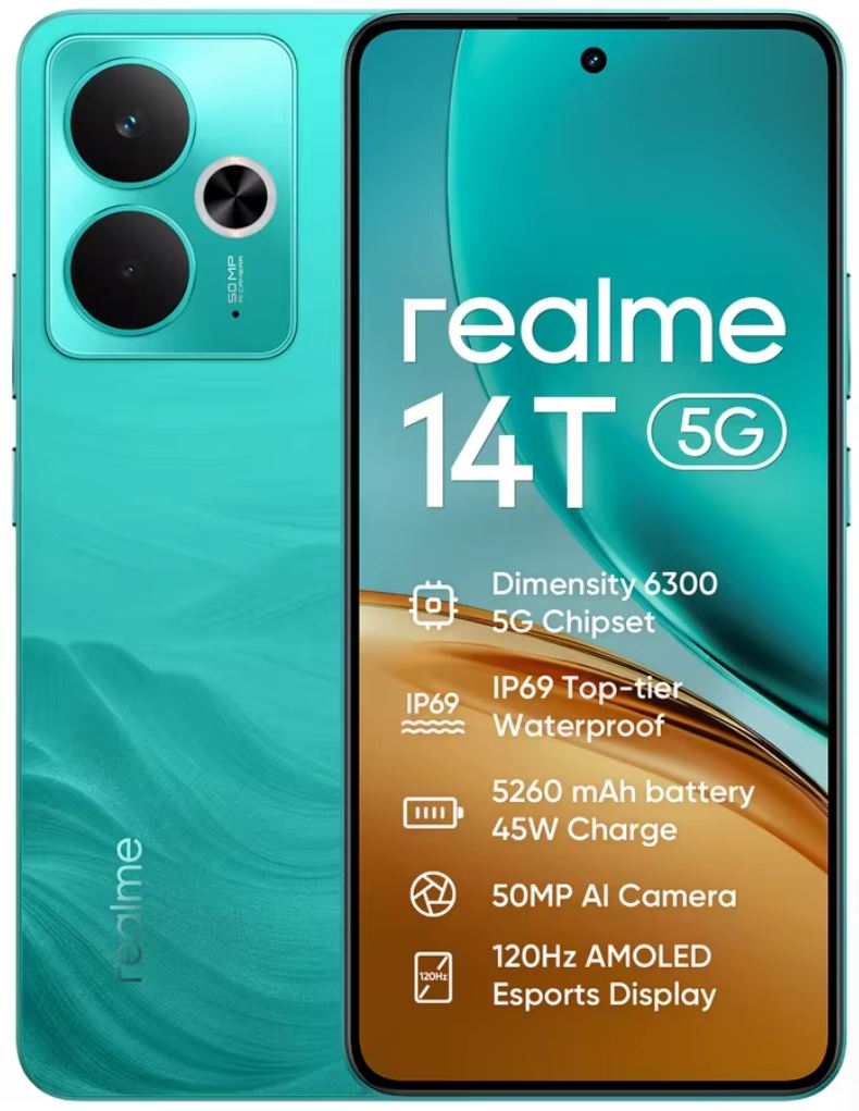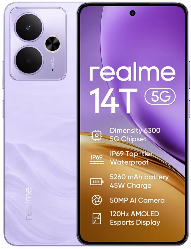 A realme 14T kijelzője 6.67 hüvelykes AMOLED, 120Hz-es frissítéssel. Nagyon fényes, a csúcsfényereje eléri a 2100 nitet, így napsütésben is jól látható. A felbontása 1080×2400 pixel, a képarány 20:9, a pixelsűrűség pedig körülbelül 386 ppi. A kijelző az előlap 91 százalékát fedi.