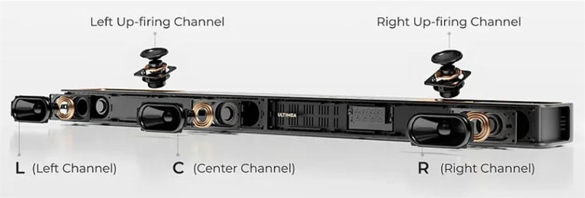 Ezek a felfele irányuló hangszórók a Dolby Atmos által képesek felettünk is megszólalni, nem csak elől és oldalt.