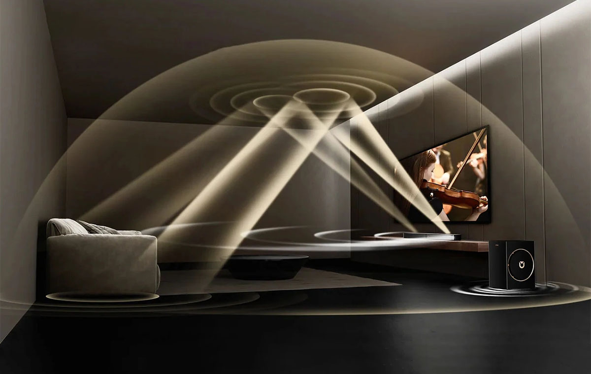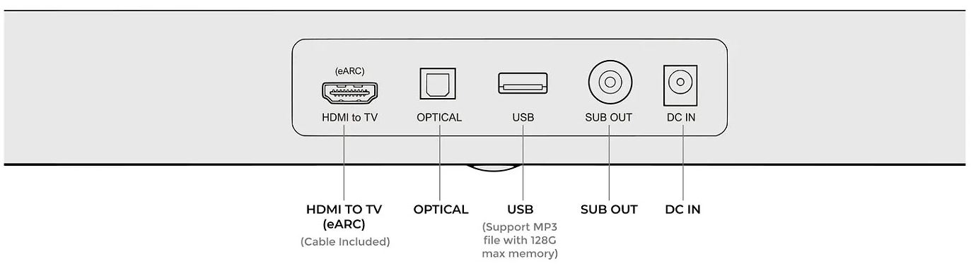 Két egységből áll, amiből az egyik a 80 cm széles soundbar. amely egy többhangszórós megoldás, köztük felfele irányuló hangszórókkal.