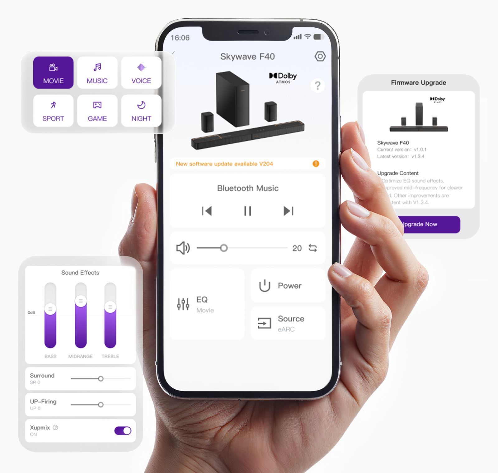 Modern, ami azt jelenti, hogy mobil alkalmazással is használható, amivel lehetséges a hangzás módosítása is és a térhangzás is finomhangolható.