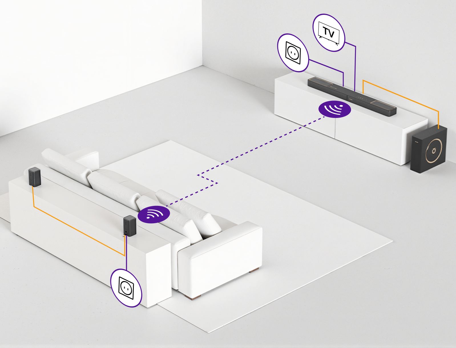 Szerencsére a hátsó hangszórók vezeték nélkül csatlakoznak, nem kell az egész szobán áthúzni a vezetékeket.