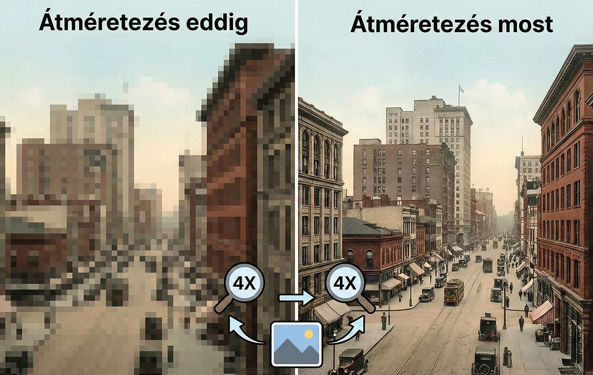 Amikor méretezünk vele, akkor az AI ezeket a részleteket próbálja meg „újrateremteni” és kiegészíteni ott, ahol az eredeti fájlban már csak homályos pixelek lennének.