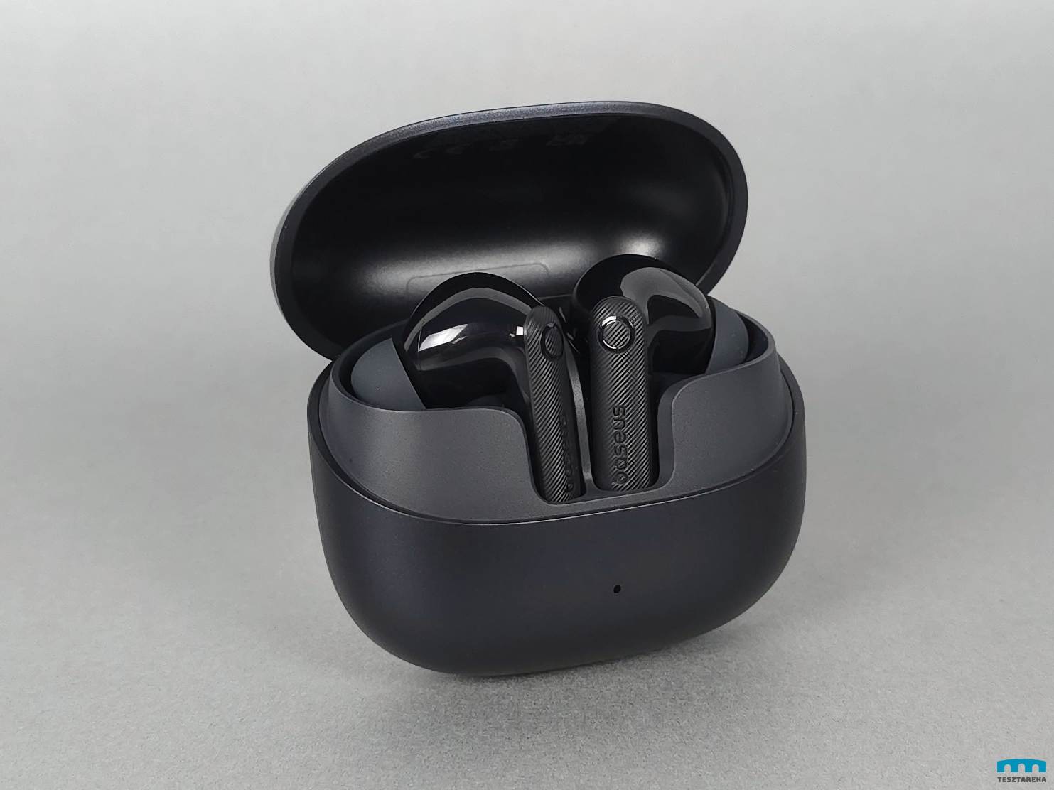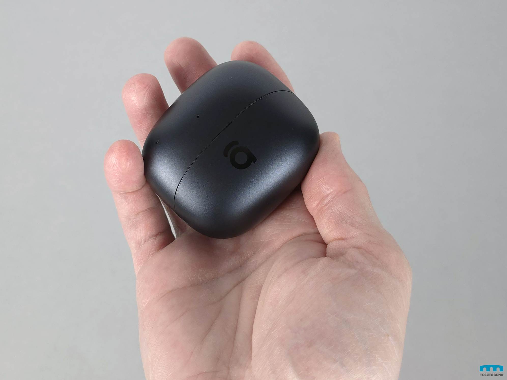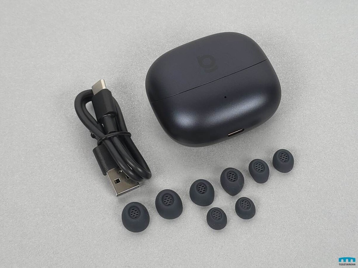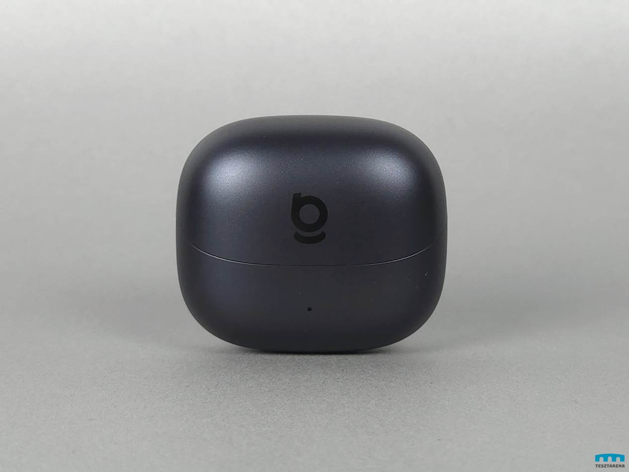 Egy feketének mondott töltőtokban vannak a fülhallgatók, ami inkább egy nagyon sötét szürke szín némi kék hatással és enyhén szemcsés felülettel.
