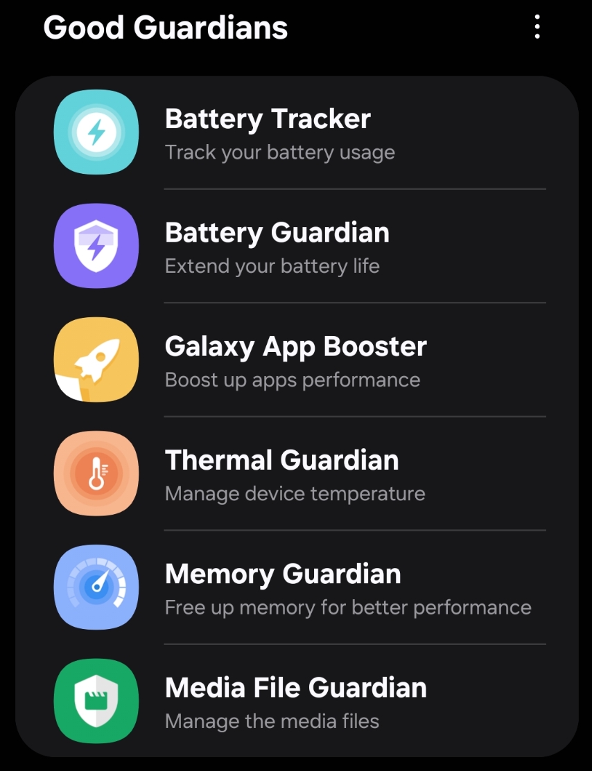 A Samsung Good Guardians egy olyan alkalmazás, amely segít optimalizálni a Samsung Galaxy készülék teljesítményét és akkumulátor élettartamát. Különböző modulokat tartalmaz, amelyek mindegyike egy adott területre fókuszál.