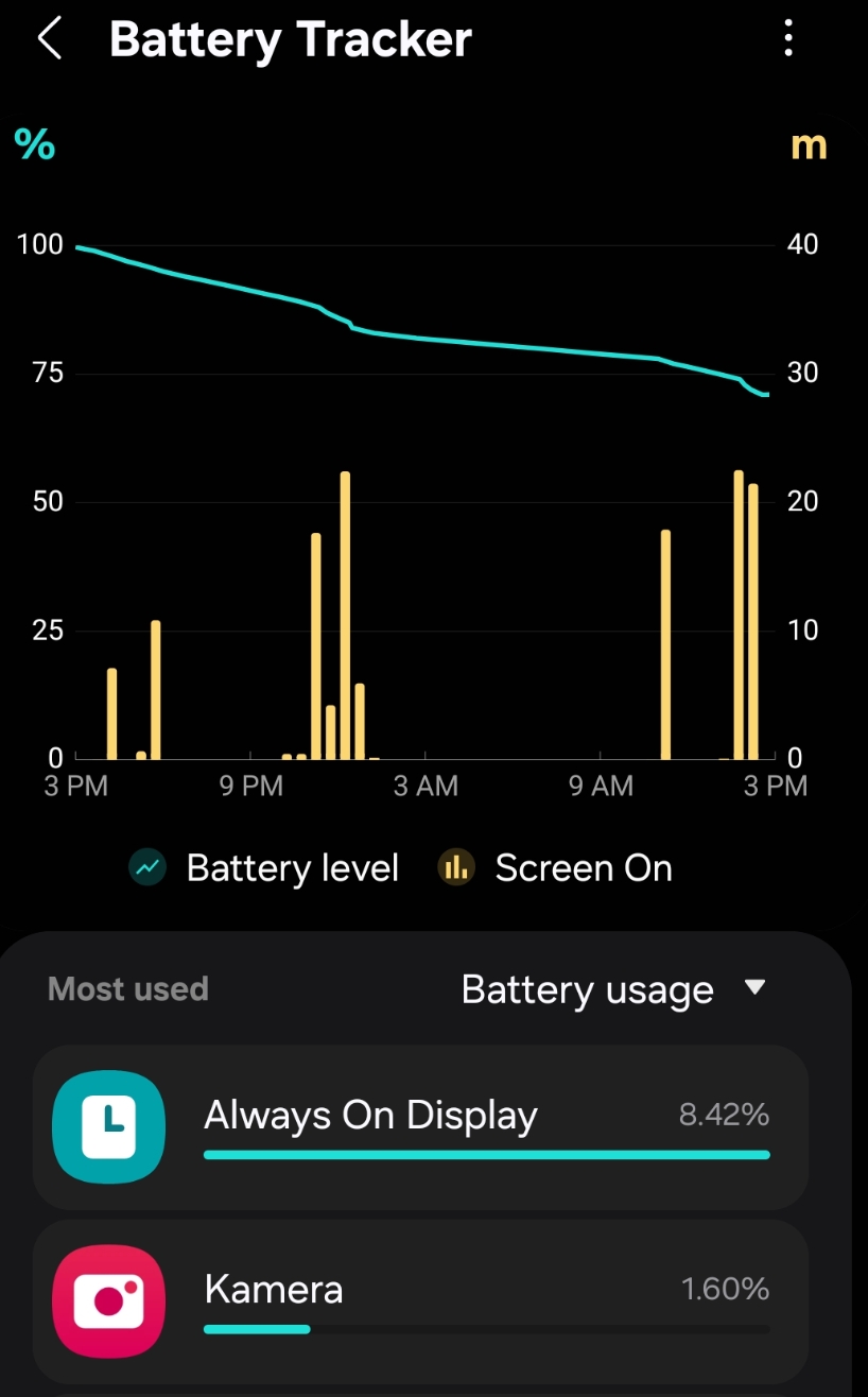 Ezen kívül a Battery Tracker részletes statisztikákat nyújt az akkumulátor töltöttségi szintjének alakulásáról és becslést ad a hátralévő üzemidőre a különböző használati módok mellett.