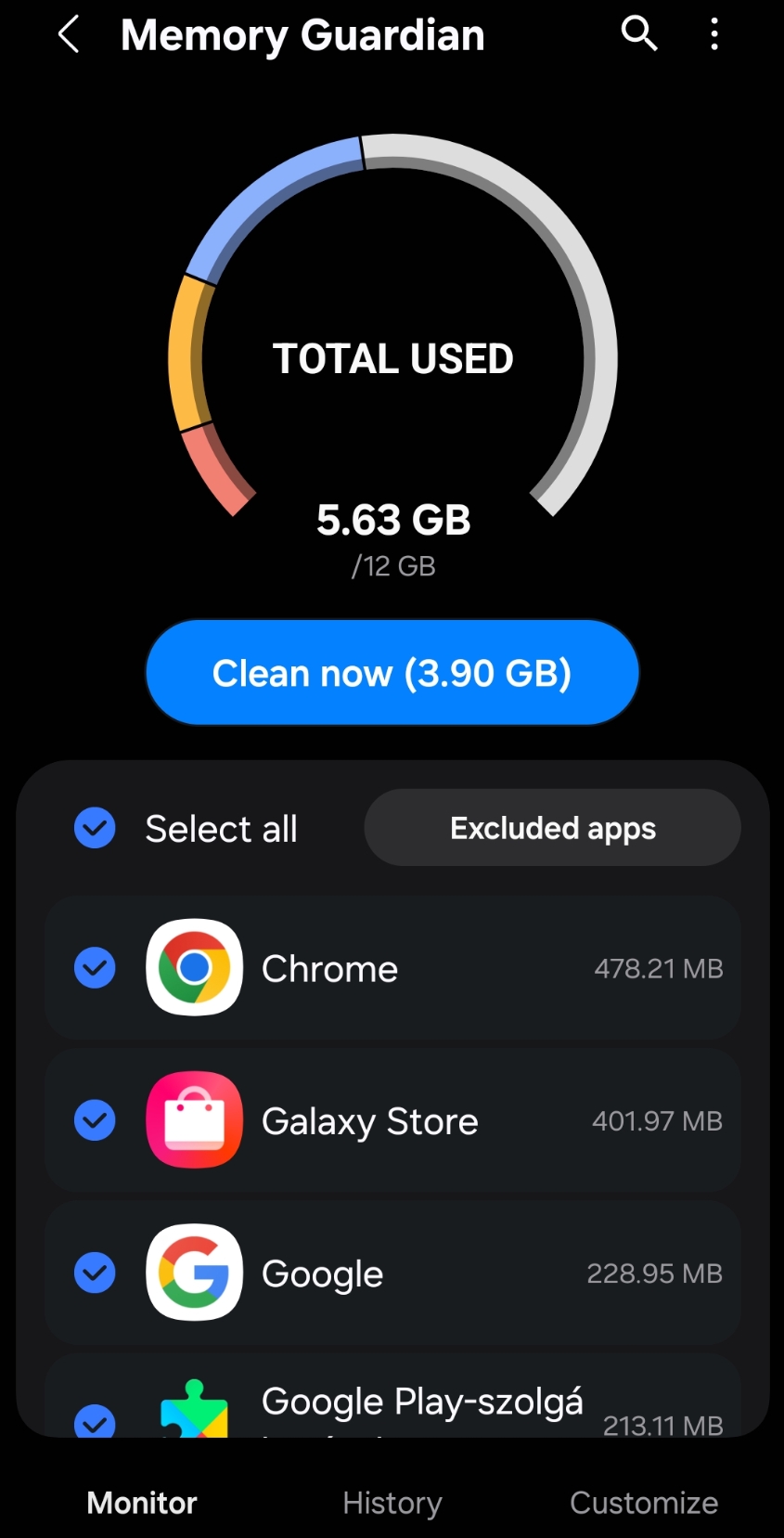 A Memory Guardian modul a készülék RAM-jának kezelésére szolgál. Megmutatja, hogy mennyi RAM van használatban és mennyi szabad.